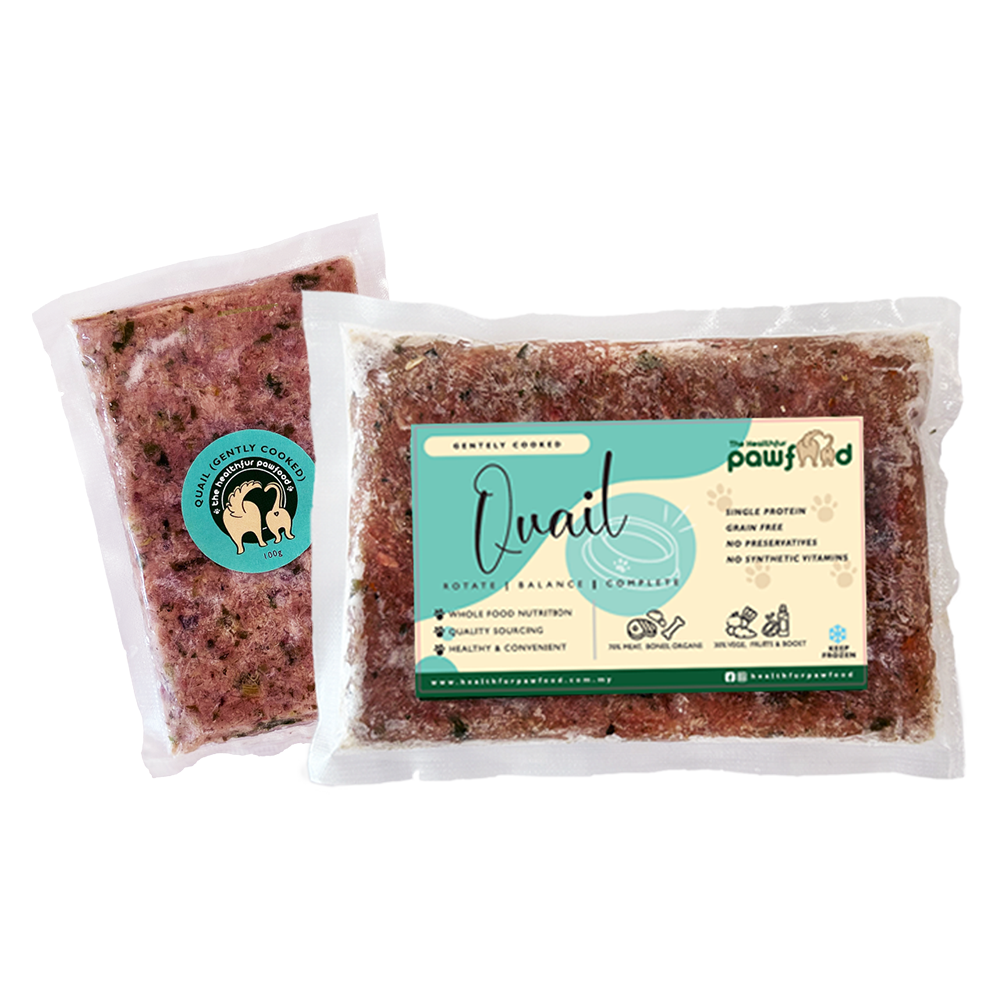 Cooked whole Quail with 10 different types of vegetables, fruits and superfood. can be a beneficial, novel protein source for pets, offering lean protein, essential vitamins, and minerals like phosphorus and iron which helps support strong muscle development and considered a hypoallergenic and highly digestible protein source, making it suitable for pets with sensitivities or allergies.