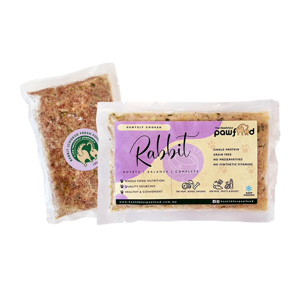 100% Local Gentle Cooked whole Rabbit Meal with 10 different vegetables, fruits and superfood content and high in protein, which can help maintain a healthy weight and support muscle development in dogs.